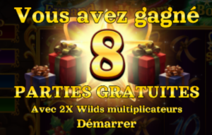 Obtenir au moins 3 scatters déclenche le mode free spins. 8 parties gratuites sont alors attribuées, avec le wild valant double.