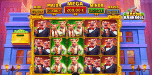 En vedette, un duo de porcs atypique : l’un, dodu, à lunettes, costume, nœud papillon rouge, liasse de billets à la patte et l’autre, svelte, en chemise blanche, bretelles rouges, cravate rayée et cigare à la patte. La fonction split symbols permet de diviser ces deux cochons, afin de générer des lignes gagnantes contenant jusqu’à 10 symboles.