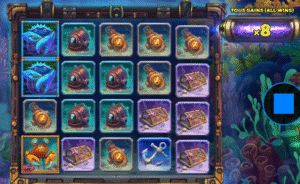 Pour débuter, les rouleaux 2 et 4 sont remplis d’algues / symboles mystères. Chaque tour, ils descendent alors d’un cran et le multiplicateur est appliqué aux éventuels gains.