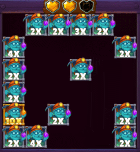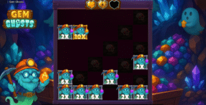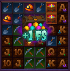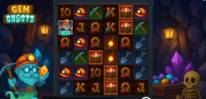 Les symboles sont à la hauteur de cette obsession : une pelle, une pioche, une lanterne, un casque, un wagonnet bien rempli… Il suffit d’en obtenir au moins 5 identiques connectés sur la grille 6×6 de Gem Ghosts pour décrocher un gain.