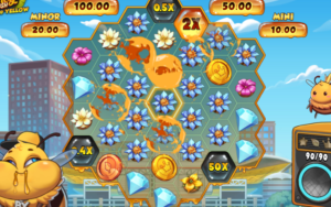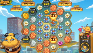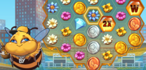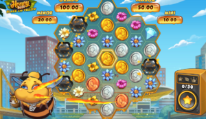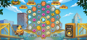 Et pour se donner des forces, elle a emmené un gros pot de miel dans lequel elle tape allègrement. Derrière elle, des gratte-ciel à perte de vue et un pont jaune suspendu reliant la ville à sa périphérie plus nature. Les symboles reprennent les mêmes codes que les précédents titres : des fleurs printanières, un diamant, des pièces bronze / argent / or. Au moins 5 symboles identiques adjacents = un gain.