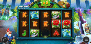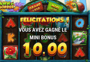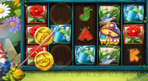 D’autres petites bestioles égayent également les spins : un escargot baveux somnole au-dessus des rouleaux et une abeille jette parfois une brassée de fleurs sur l’écran. Les symboles restent dans la mouvance, avec un arrosoir, une fleur rouge éclatante, une pelle de jardinier… Le wild étant symbolisé par un champignon (magique ?) qui peut apparaître sur tous les rouleaux.