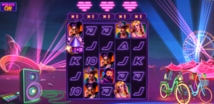 Hacksaw Gaming apprécie la variété. Après son raton laveur à toutes les sauces (Le Santa, Le Cow-boy, Le Zeus & compagnie), son biker reconverti en livreur de journaux (Paper Biker), son esprit du vent (Aiko and the Wind Spirit) ou encore son cuistot de rue (Fred’s Food Truck), voici que l’éditeur s’intéresse à la techno, de préférence sauvage… Il a ainsi posé chapiteaux et enceintes dans l’environnement désertique de Mirage City, pour un événement à la hauteur du gigantisme des lieux.