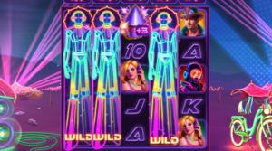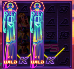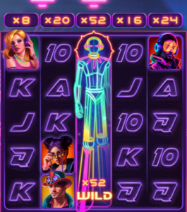 Le wild est symbolisé par un robot composé de néons couleur turquoise, jaune et rose. Sa particularité : il s’étend intégralement quand il peut déclencher une combinaison gagnante.