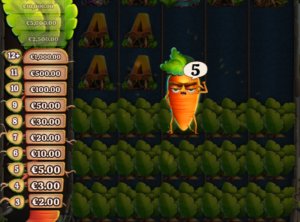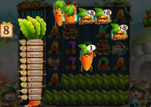 Cette machine à sous est bourrée de fonctions spéciales, y compris dans son jeu de base. Pour commencer, un compteur de carottes situé à gauche des rouleaux totalise les légumes qui atterrissent au cours d’un même tour, peu importe leur position. De ce nombre dépend l’importance de la récompense instantanée attribuée par cette fonction The Carrot : de x2 pour 3 symboles à x1 000 la mise pour 12 carottes et plus.