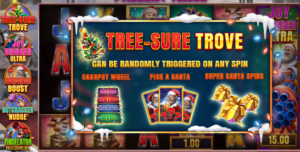 Le jeu bonus boosté, intitulé Super Santa Spins, ne s’active que grâce au Tree-sure Trove.