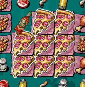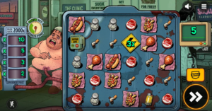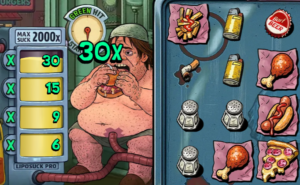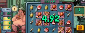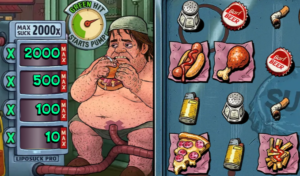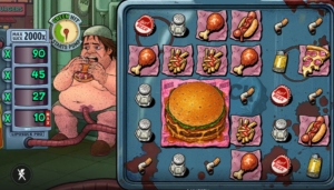 À en juger par les symboles, tout est fait pour maximiser la production de gras et le déclenchement d’un AVC : pizza dégoulinante de fromage, frites juteuses d’huile, hot-dog généreusement arrosé de ketchup, cuisse de poulet frit, salière, capsule de bière, mégot écrasé, briquet… Bref, notre protagoniste joue avec sa vie, car l’arrêt cardiaque le guette à chaque bouchée et à chaque bouffée. Et les fonctionnalités restent dans le même état d’esprit, avec des dénominations fort à propos comme la vie sur un plateau ou un peu de sauce piquante avec ça.. Le jeu bonus met d’ailleurs à l’honneur une pompe liposuck qui ne chôme pas pendant les tours gratuits !