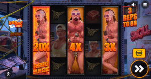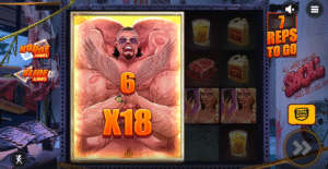 En obtenir 3 active le jeu bonus Nudge Reps. 6 tours sont alors attribués, avec le symbole Swoll partiellement visible qui se déplace systématiquement pour couvrir entièrement le rouleau.